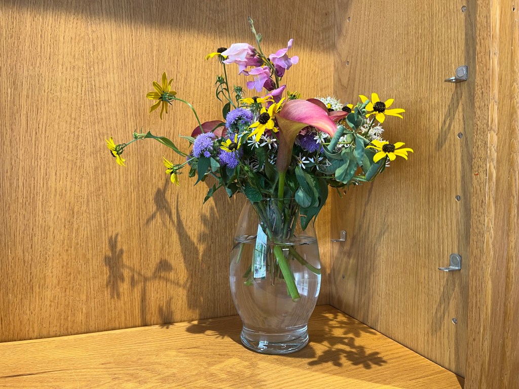 Dave has built the huge riser for the front of the store that was my vision. While it was in progress we heard the jokes; it’s a hot tub, it’s a stage for Jane’s dance routine…humor is what keeps us all going!  And the little gifts brought our way keep us going too; the flowers, the fresh squash from the garden, a loaf of bread…thank you to everyone.  We love you back. Click on any image to see them larger.