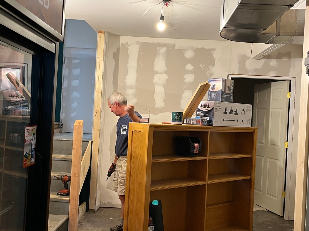 And Bob continues with his electrical work wiring the whole building while keeping me happy by installing light fixtures; are these the right height?  Can Jim stand under them?  Are the lights adjusted to the right temperature to make the room seem inviting?  Do the cases have a shadow?  We have started from scratch installing energy efficient LED lighting removing the old costly florescent that was previously there.