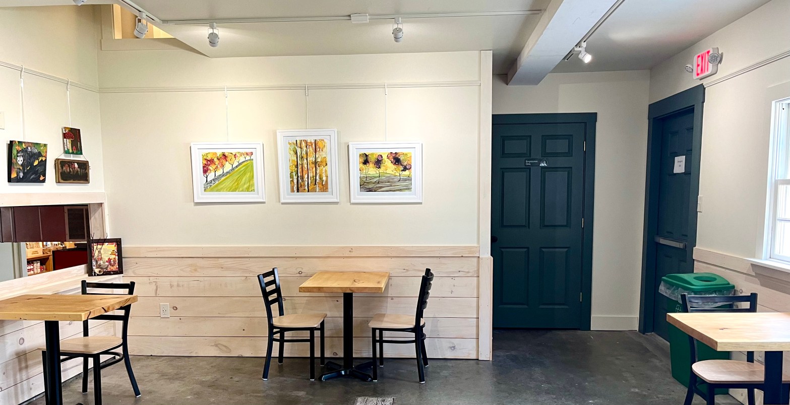 The art show by our own Canterbury Artists lines the walls of the Feed Loft. Tomorrow opens their show “What Lurks in the Woods” Come to see all their work and see the calendar below for a Meet the Artist event.