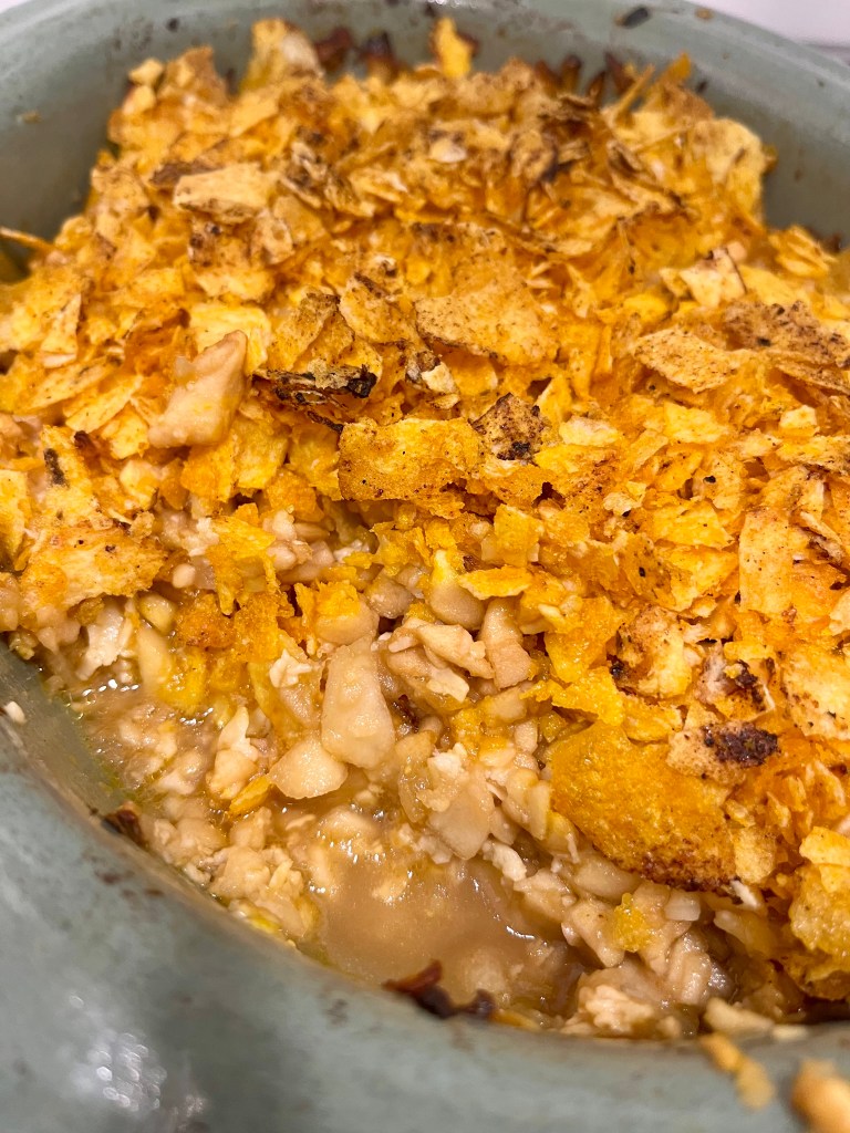 Place mixture into an oiled heavy shallow baking dish. Top the mixture with 1 cup of crushed Honey Bar B Que potato chips. Bake 375º for 40 minutes until liquid is bubbling and chips are very browned. Serve with potato chips for dipping.