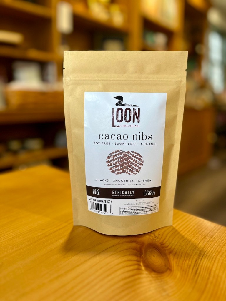 Another “color” from our palette is the Loon Cocoa Nibs we now carry. Have you heard of nibs? They are shelled roasted cocoa beans, not sweetened, but left in their crunchy pre-ground form perfect for blending into smoothies or tossed over yogurt as an anti-oxidant flavor boost. They are good for you! I have used them for years in my baking as a replacement for chocolate chips; in cookies, scattered over a pavlova or in a brownie. You can read more about the health benefits of chocolate in a recent post we did by clicking here.