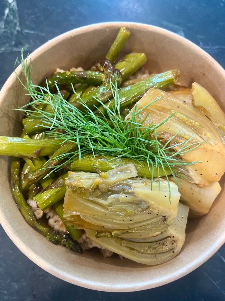 - 1 bunch of Harry’s asparagus, snapped into pieces; around 1lb. No need to trim; the hardened ends will cook down.