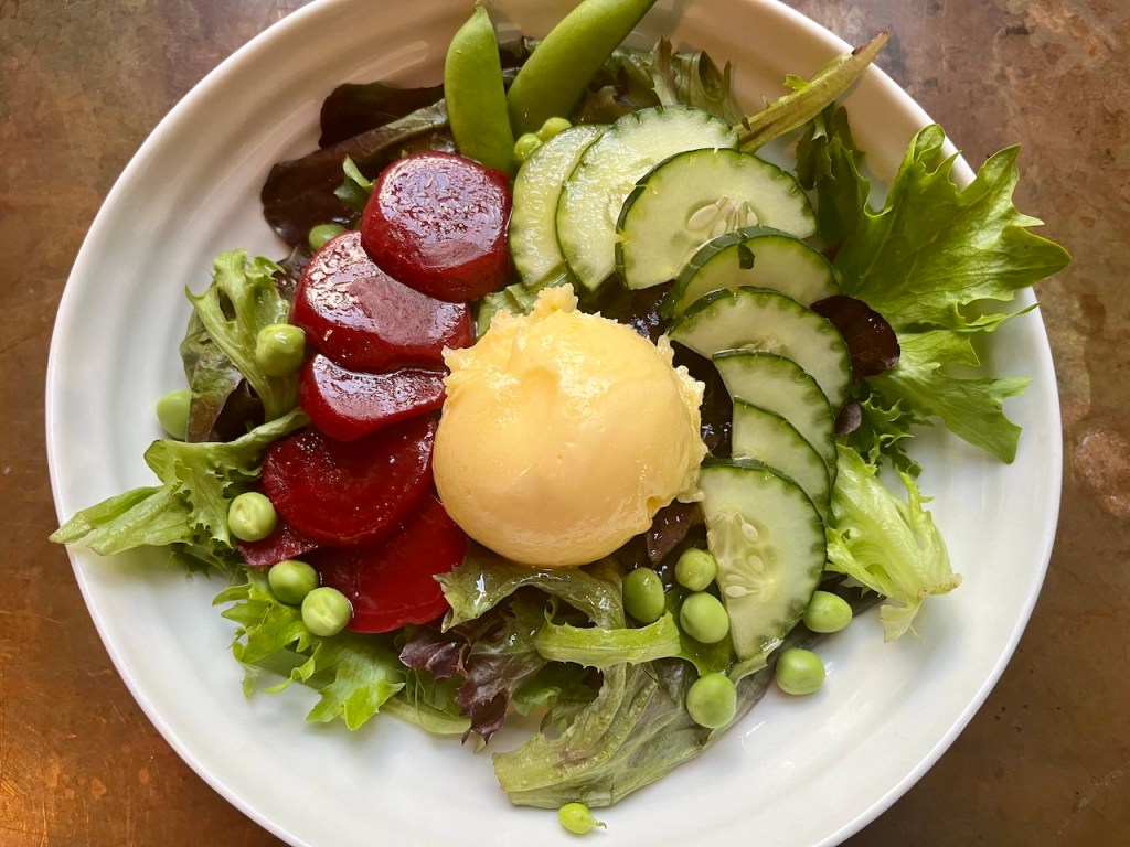 - Add some sweeter vegetables over that. I used fresh peas (not cooked), cucumbers and canned beets