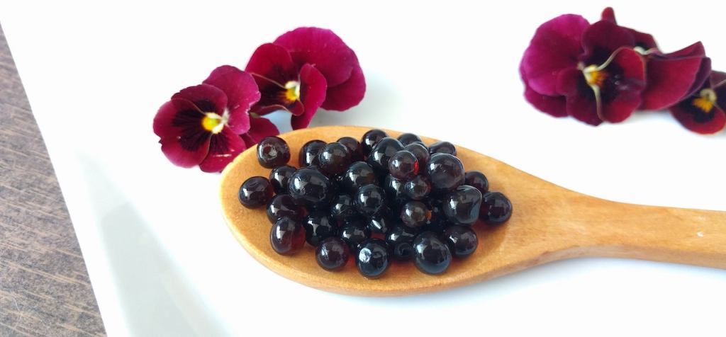 Balsamic pearls! Little bubbles of aged, sweet & tart balsamic vinegar syrup that pop in your mouth like caviar. Spoon them over cheese or fruit or add them to any cooked dish as a finishing flavor. Ask to try some.