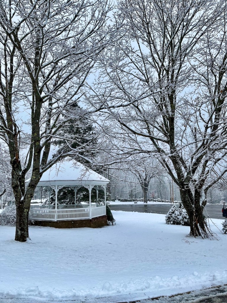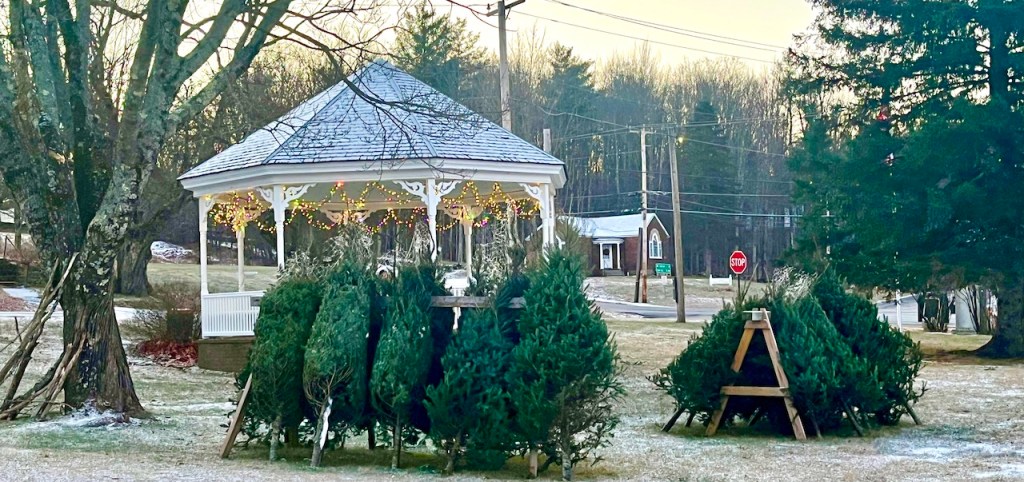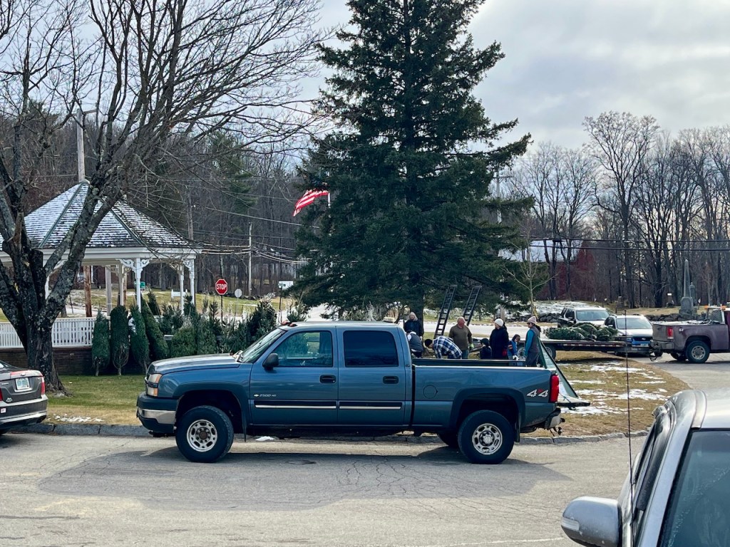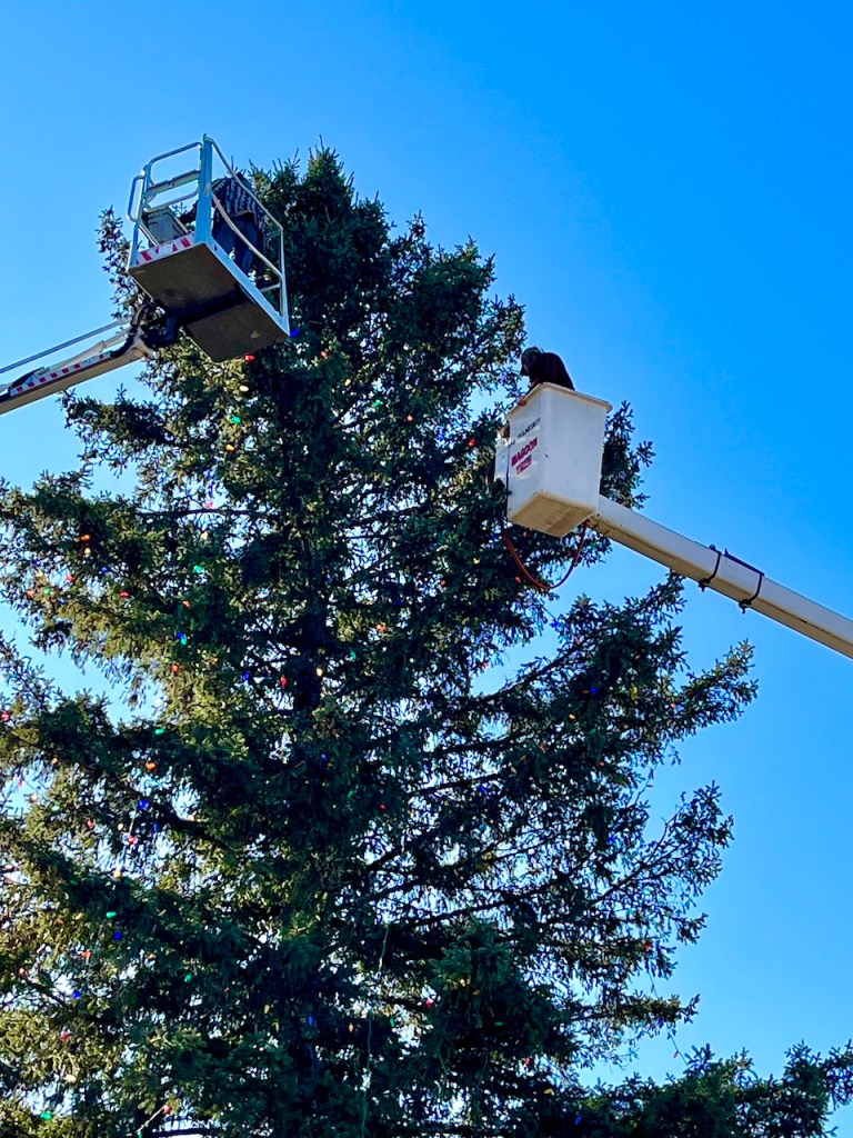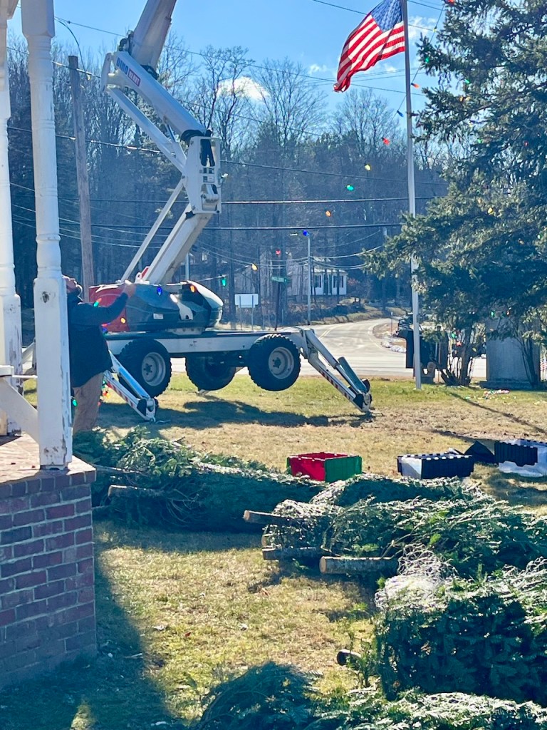 The magic of PTO Christmas trees being delivered to the green then the stringing up the lights on the BIG tree and donning the gazebo.