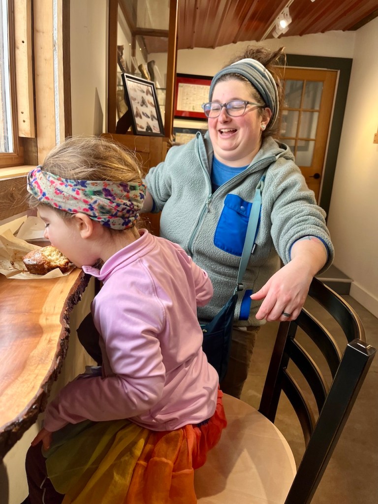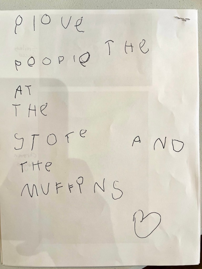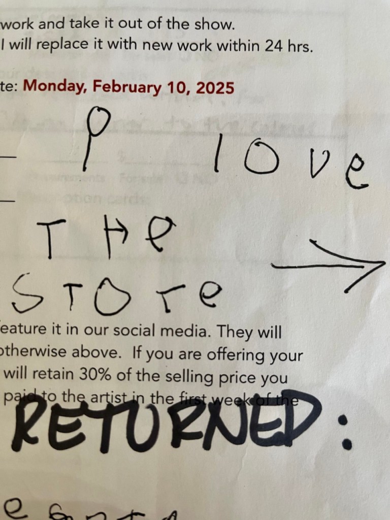 When artist Sylvie, age 5, signed her return form, she left us a very nice message. Then during the discussion group she demonstrated her love of our muffins. Also look for her slippers knitted by mom Lynn that she wanted in this new show SHOES. We love you back Sylvie.