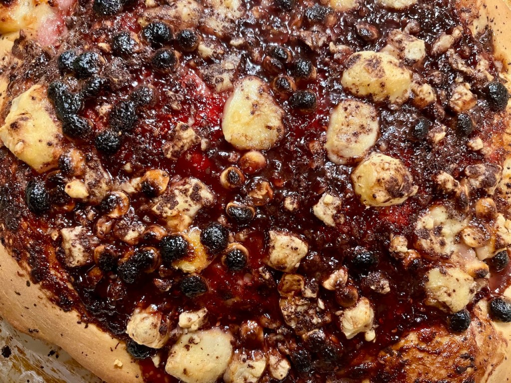 Continuing our theme of chocolate all this month, here is a recipe that seems weird, but it is delicious. The tang of cheese with the sweetness of fruit and chocolate is just like a charcuterie platter served up on a pizza round!