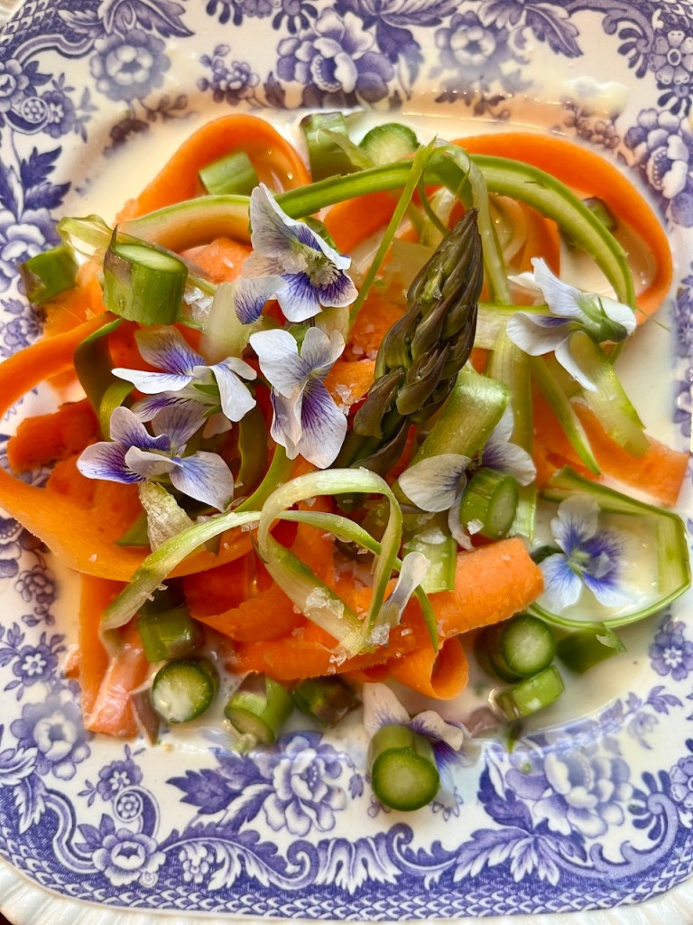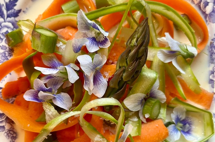 Using a vegetable peeler, shave long shards of carrots and raw asparagus. Pile up on a plate in a random curly pattern then scatter with 1/4″ slices of more raw asparagus. Scatter with violet blossoms picked from your yard. This is an art project.