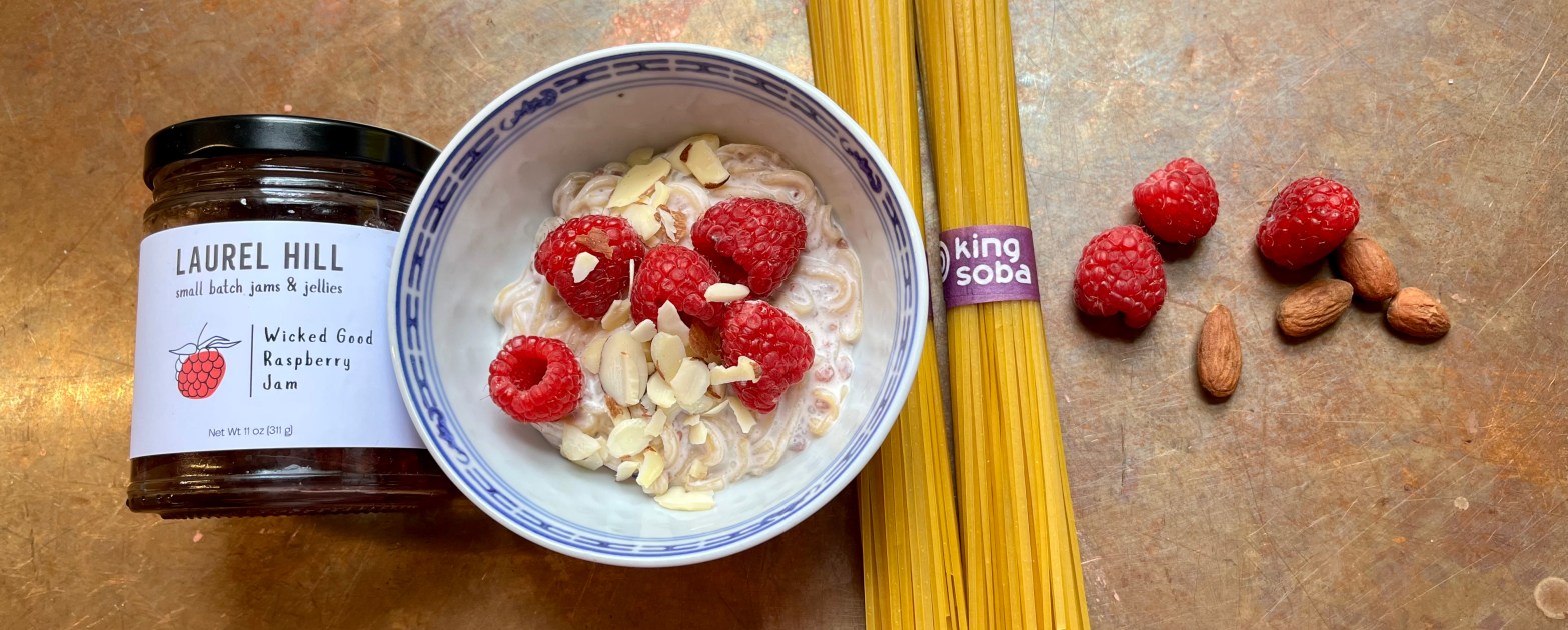 We tend to think of jam as something just spread on bread. But if you think of it as concentrated flavor it can make an excellent topping for ice cream or mixed into your crumbles for extra flavor and even in salad dressings! I offer you another way to try jam with this unusual not-too-sweet warm weather noodle dessert. It is made with buckwheat noodles so is naturally gluten-free if you care.