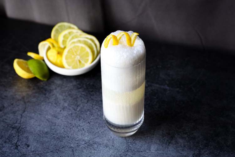 Shake really well or blend in blender for a moment until mixture is frothy. Pour immediately into a glass up to 2/3 full. Pour over this the last 1/3 of the way: