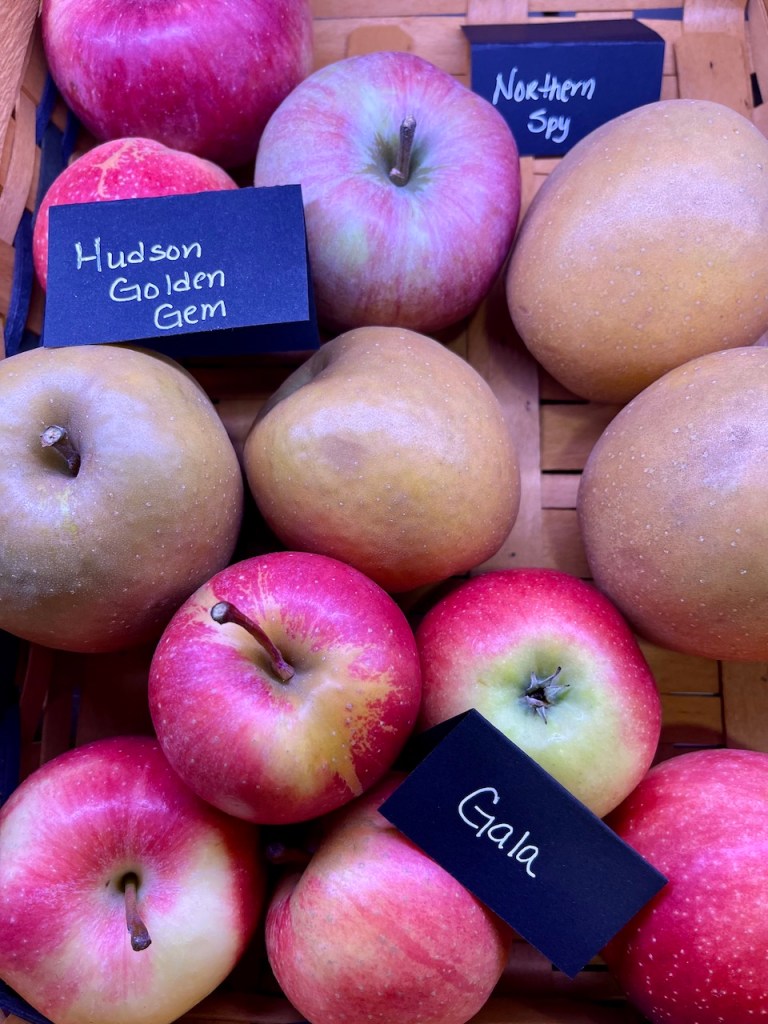 Cut up several apples of your choice into like-sized pieces then toss them in a mixture of the juice of one lemon and 2T. of orange juice concentrate; drain and refrigerate. This keeps them from turning brown and enhances the citrus flavor of the salad. The Golden Gem apples we sell compliments the copper/russet color of the carrots.